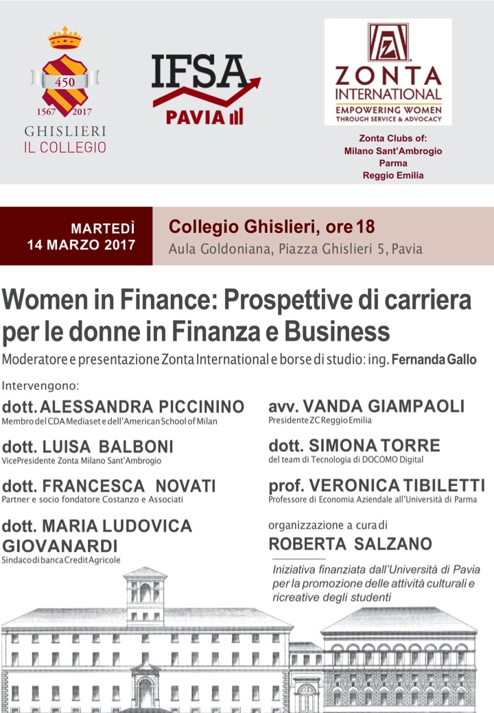Gli Zonta Club italiani sono attivi nella promozione di carriere nei settori considerati tradizionalmente“maschili”. ZC Milano Sant’Ambrogio, in collaborazione con i club di Parma e Reggio Emilia ha avviato, su invito di IFSA – International Finance Students Association, sezione della facoltà di Economia e Commercio dell’Università di Pavia, un panel di donne in carriera nella Finanza e nel Business a orientamento delle scelte