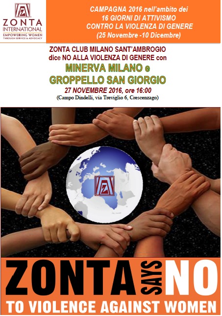 - “Tutti uniti contro la violenza di Genere” – 24 novembre- evento congiunto con ADGI e Consulta Interassociativa femminile http://www.zontamilanosantambrogio.eu/campagna-zonta-says-no-2017-zonta-milano-santambrogio-aderisce-al-programma-tutti-uniti-contro-la-violenza-di-genere-di-adgi-e-consulta-interassociativa-femminile/