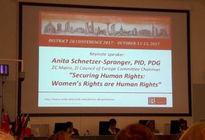 del nostro Direttore Internazionale Judith Kautz, americana, della rappresentante di Zonta International presso il Consiglio d’Europa Anita Schnetzer-Spranger, della nostra Governor Dietlind Stuerz, delle officers del distretto internazionale e dell’area italiana, nonché delle delegate dei 60 clubs Zonta appartenenti al nostro